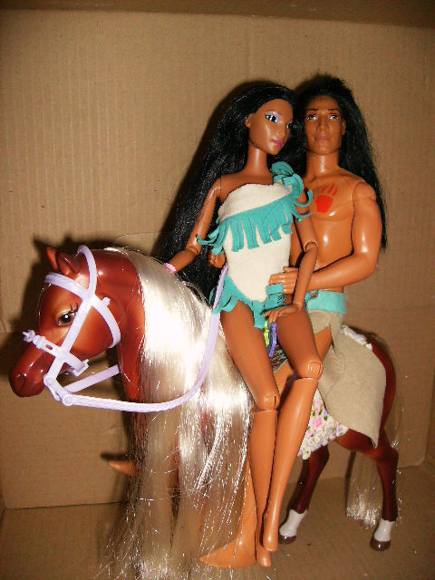 Jak wiecie, mam fioła na punkcie lalek (i innych rzeczy ^^) Native American. Zawsze miałam. W dzieciństwie nie miałam nigdy barbiowego konia, chociaż bardzo chciałam. Mojego pierwszego kupiłam przypadkowo, jako dodatek na aukcji, w której licytowałam dla lalek. Nie miałam koncepcji, co z nim zrobić, ale zatrzymałam go, czekając, aż koncepcja do mnie przyjdzie ;). No i przyszła, kiedy przekopywałam się przez pudło luźnych rzeczy, żeby zdecydować, co chcę zostawić, a co sprzedać. Koncepcja przyszła i kopnęła mnie w cztery litery za to, że nie zauważyłam jej wcześniej ^^. Ciałka fashionistas są bardzo artykułowalne i świetnie pozowałyby na koniu, prawda? Zamieniłam główkę jednej z Pocahontas (tej od Bogny) na ciało fashionistas, prawda? Tubylcza Amerykanka wyglądałaby świetnie na końskim grzbiecie, prawda? Prawda! To czemu, głuptaska, nie pomyślałam o tym wcześniej ^^. No i mam drugiego Kocouma, kupionego na aukcji w stanie używanym. Uncas (Kocoum, któego kupiłam NRFB) okazał się świetnym partnerem dla Nii Western Fun. Ten używany Kocoum (który zostanie z tym imieniem) wydaje się być drugą połówką Lozen (Pocahontas od Bogny).